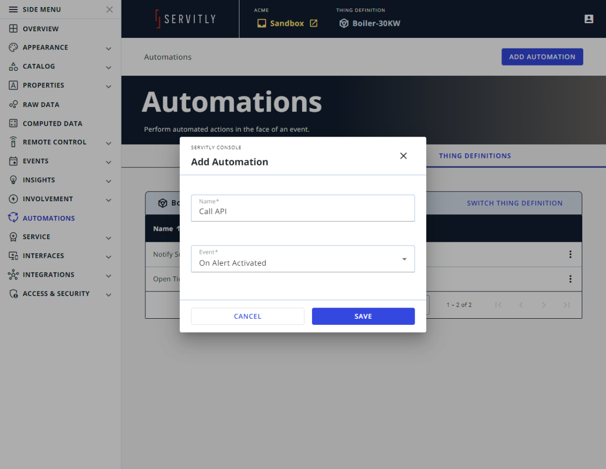 By selecting an Automation, you can edit its properties, including event and the related actions to be executed.
