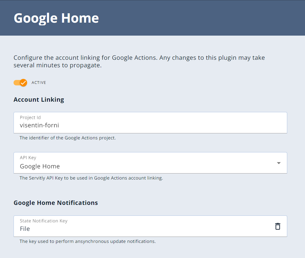 To enable notifications, from the Servitly Console, in the Google Home plugin, a key for the service account must be uploaded.