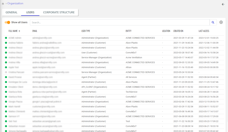 Within the Organization or Customer Accounts page, the Users page has been improved, and it is now possible, in addition to direct users, to manage external users belonging to other related business entities. For example, an OEM Back-office user can search for a user in the entire DPS, or an administrator user of a customer can create a user directly on a specific location, or search for a user among all users of that customer.