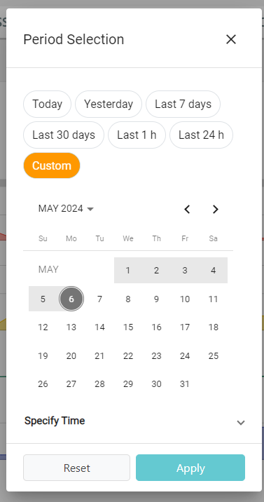 By clicking on the period button, a popup allows you selecting a period from a predefined set or instead specify a custom one through the calendar. Optionally, the time of day can also be specified for more accurate data analysis.